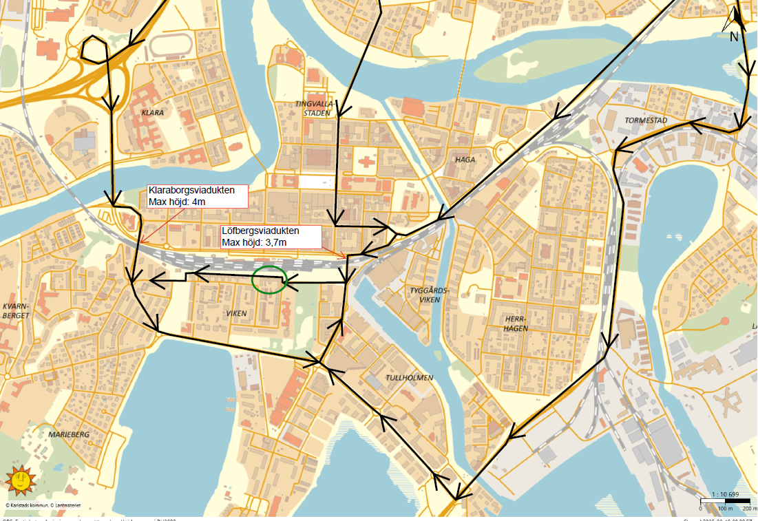 Om du kör buss - var uppmärksam på hur hög din buss är. Det vinns två viadukter med begränsad höjd, se karta här nedanför. Har du en buss som är högre så bör du åka av E18 och ta Hammaröleden, Packhusallén och Tullhusgatan till Trädgårdsgatan.