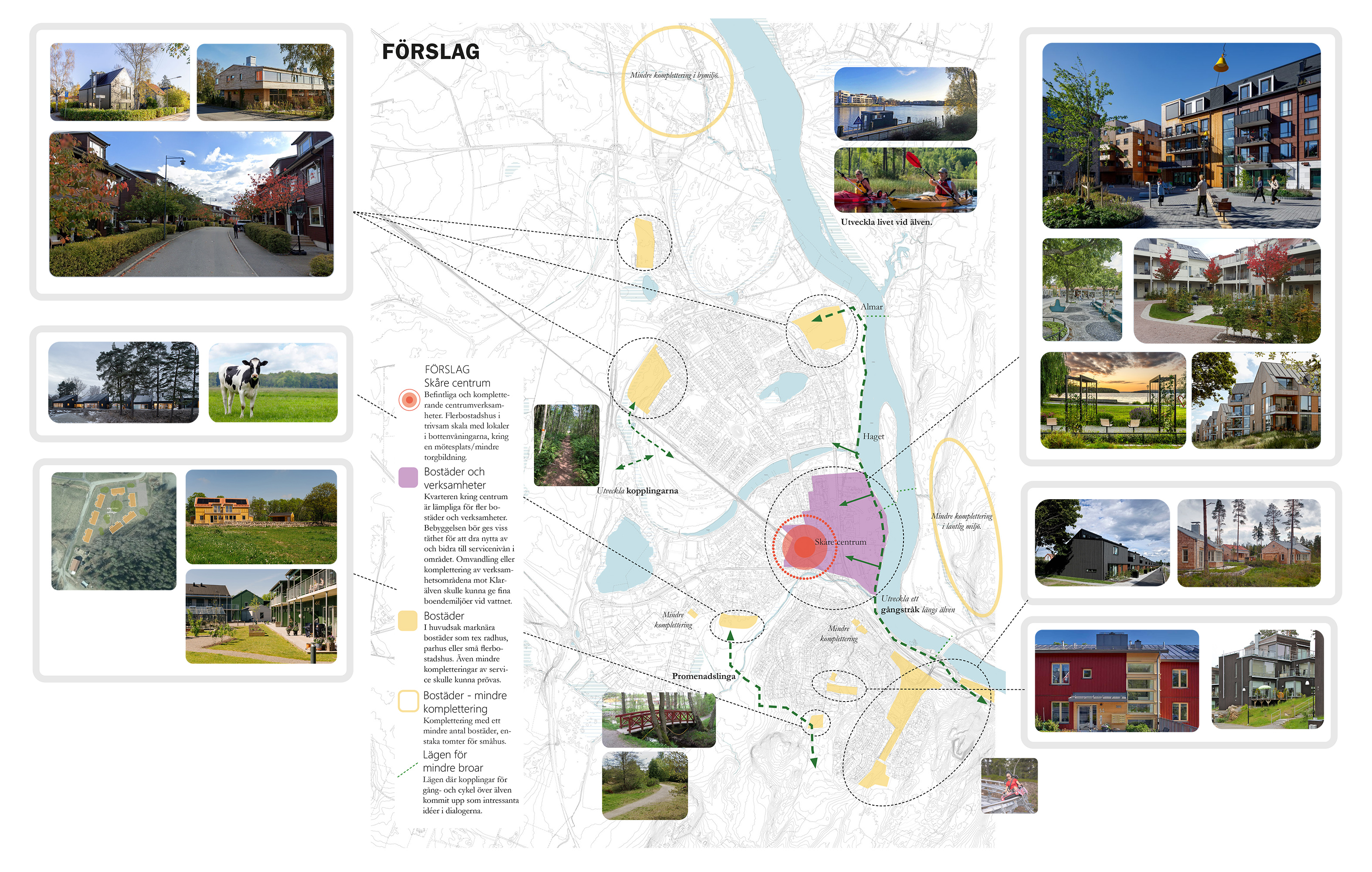 Förslaget utgår från att bygga vidare, utveckla och förtäta centrala Skåre i första hand. Området kring centrum har potential att utvecklas till en starkare knutpunkt, som med bebyggelse och gestaltning av stadsrummen mellan husen, kan fungera tydligare som mötesplats för tätorten. Det är också någonting som på olika sätt efterfrågats i dialogen. Förutom bostadslägen kring centrum där närhet till kommersiell och offentlig service finns, så finns det även möjligheter till bostäder i fina lägen ner mot Klarälven. Här kan bostäder komplettera befintliga verksamheter eller på sikt ersätta en del av verksamheterna i det fall de finner annan lokalisering.