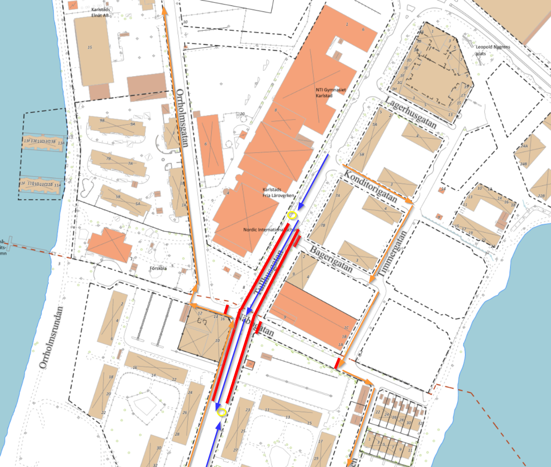 Det kommer vara stängt från Näbbgatan, Bagerigatan och Orrholmsgatan/Näbbgatan till Tullhusgatan. Gående och cyklister kommer ledas om. Följ anvisningen på platsen!